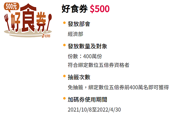 4.綁定數位卷前400萬名,免抽有好食卷500元(適用於餐飲、糕餅、夜市/市場之攤商及小微店家等)