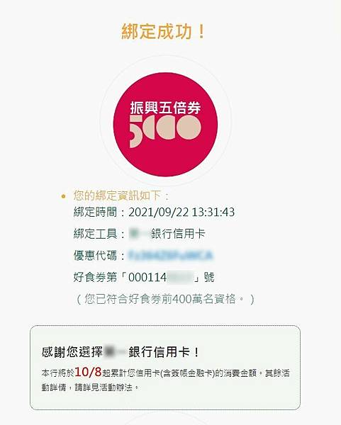5.之後就等10/8開始刷卡消費5000元+使用好食卷+其他加碼卷中獎通知。(連結)